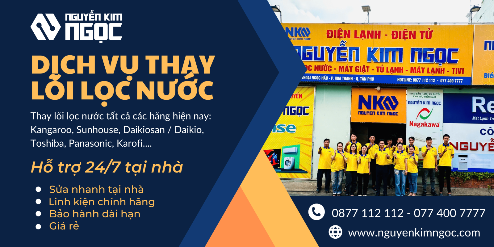 Trung Tâm Sửa Chữa Điện Máy Nguyễn Kim Ngọc là trung tâm sửa chữa – bảo trì – thay lõi lọc nước uy tín với hơn 10 năm kinh nghiệm. Chúng tôi sở hữu đội ngũ kỹ thuật viên chuyên môn cao, có mặt nhanh trong 20–30 phút, phục vụ tất cả quận huyện TP.HCM và tỉnh thành khác.